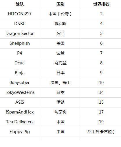 昨日的黑马,来自中国高校成员组成的flappypig战队,也成绩不俗,获得第七!