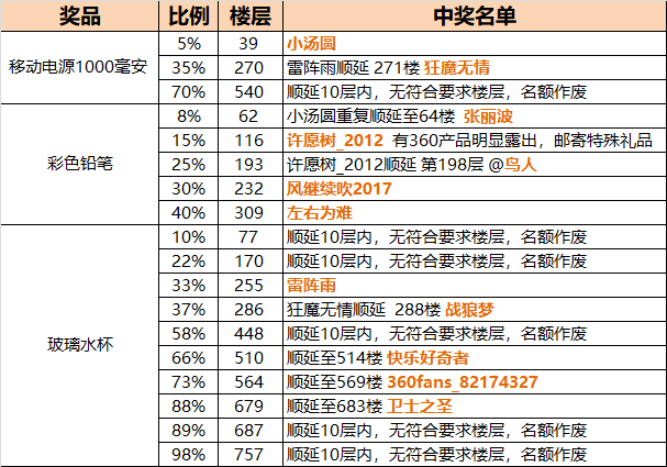 【奖品及抽奖方式】 获奖名额:18人 奇酷10000毫安移动电源*3(总楼层的5%、35%、70%) 360彩色铅笔*5(总楼层的8%、15%、25%、30%、40%) 360玻璃水杯*10(总楼层的10%、22%、33%、37%、58%、66%、73%、88%、89%、98%)